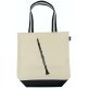Elegancka, kremowa torba typu shopper z motywem czarno-srebrnego klarnetu, wykonana z porządnego, grubego materiału. Dodatkowe, skórzane zabezpieczenie u dołu. Torba nie posiada zapięcia.