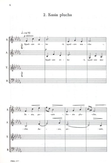 Partytura studyjna nie upoważnia do kopiowania i sporządzania głosów wykonawczych. W celu legalnego nabycia większej ilości partytur chóralnych, po preferencyjnych cenach dla zespołu, prosimy wysłać e-mail pod adres: handel@pwm.com.pl lub zajrzeć tutaj Tekst oparto na słowach ludowych