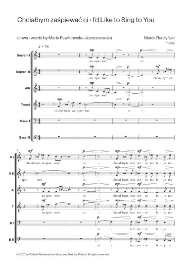 Kompozycja „Chciałbym zaśpiewać ci” powstała w wyniku zainspirowania twórczością Marii Pawlikowskiej-Jasnorzewskiej. Przepełniony emocjami tekst wiersza stał się impulsem do powstania utworu nawiązującego formą do romantycznej pieśni chóralnej. Muzyczna narracja oraz wykorzystane środki techniki kompozytorskiej łączą się nierozerwalnie ze słowem i jego warstwą emocjonalną. Zamierzeniem moim było – cytując Bohdana Pocieja – „wypowiedzieć treść słowną muzycznym językiem uczuć”. Marek Raczyński   Materiały wykonawcze dla chóru w specjalnej, niższej cenie. Skontaktuj się z nami.: handel@pwm.com.pl